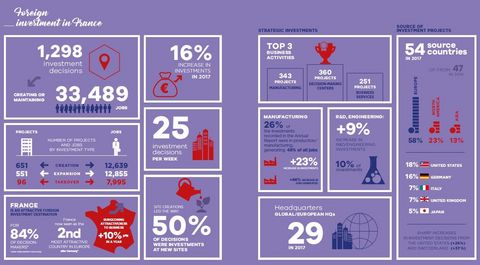 France attracted 1,298 new foreign investment decisions creating jobs, an increase of 16% compared to 2016, which enabled 33,489 jobs to be created or maintained.