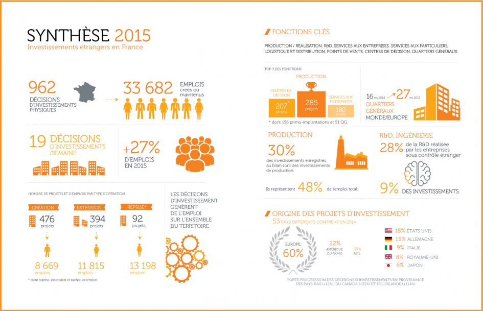 Le bilan publié en mars par l’agence Business France démontre en effet des résultats très positifs pour l’année 2015 : 962 décisions d’investissements de sociétés étrangères ont permis la création ou le maintien de 33 682 emplois, soit 27% de plus qu’en 2014. Les exportations de biens français ont elles aussi progressé en 2015 et ont atteint 455,1 milliards d’euros. La France se place d’ailleurs au 3ème rang mondial des pays exportateurs de services