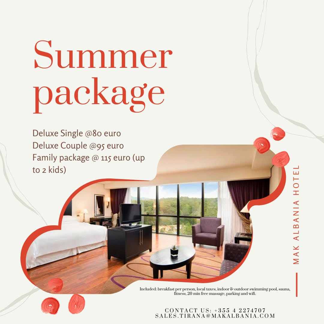 Included: breakfast per person, local taxes, indoor & outdoor swimming pool, sauna, fitness, 20 min free massage, parking and wifi.