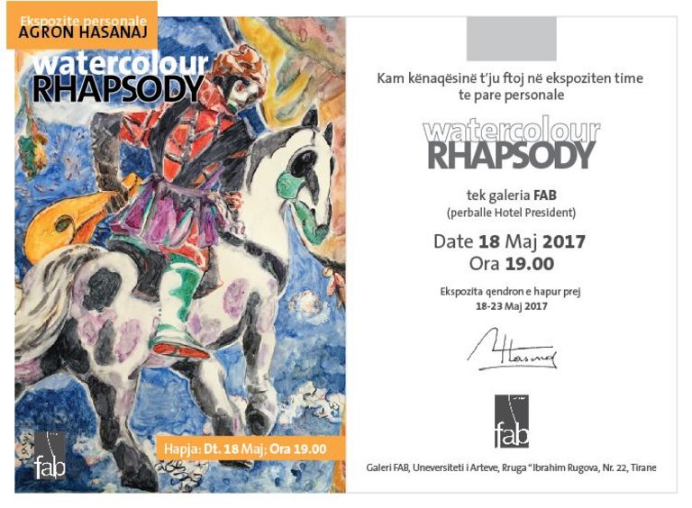 Kemi kenaqesine te njoftojme per Hapjen e Ekspozites Personale me punime ne Aquarel te piktorit Agron Hasanaj. Ekspozita hapet ne date 18 Maj ora…