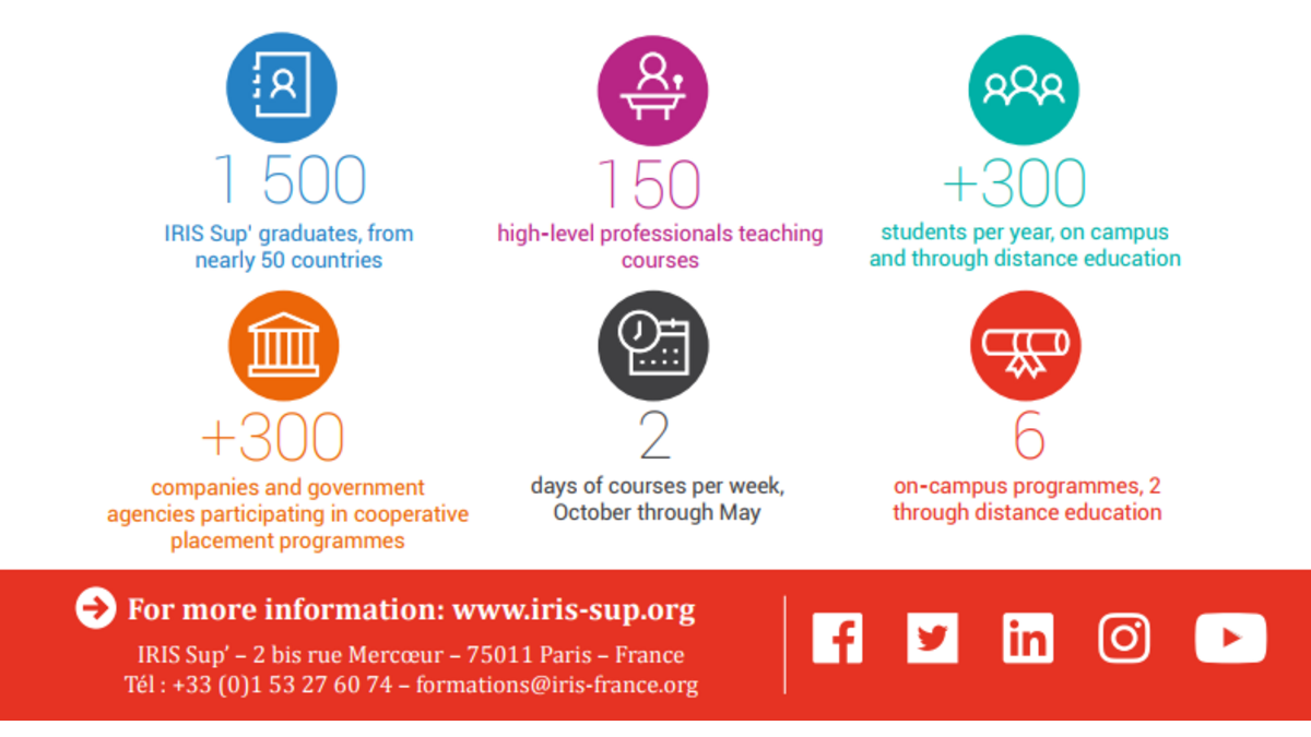 IRIS Sup’, a school for IRIS Established in 2002 by IRIS, IRIS Sup’ is a private degreegranting institution accredited by the Paris national education authority. Its mission is to provide internationally oriented education to students and professionals in various fields of study. IRIS Sup’ confers level 1 professional certifications accredited by France’s national professional certification directory (Répertoire national des certifications professionnelles or RNCP), equivalent to level 7 certifications from the European Union.