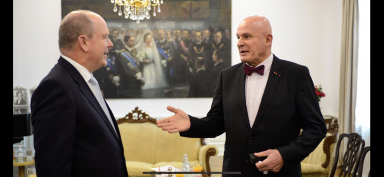 Kryetari yne Julien Roche dhe Princi Sovran i Monakos, Lartësia eTij Albert II ne ambjentet e Oborrit Mbretëror në Shqipëri. Kjo është vizita e parë…