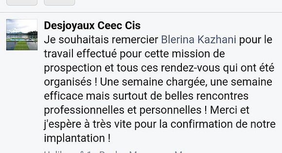 Je tiens à remercier l'équipe de la CCI de cette intégration qui est importante à mes yeux (bon guide, bons choix). Je tiens aussi à remercier toutes les personnes destinataires pour leur accueil, professionnalisme, efficacité, sympathie, qui nous ont grandement facilité les démarches.